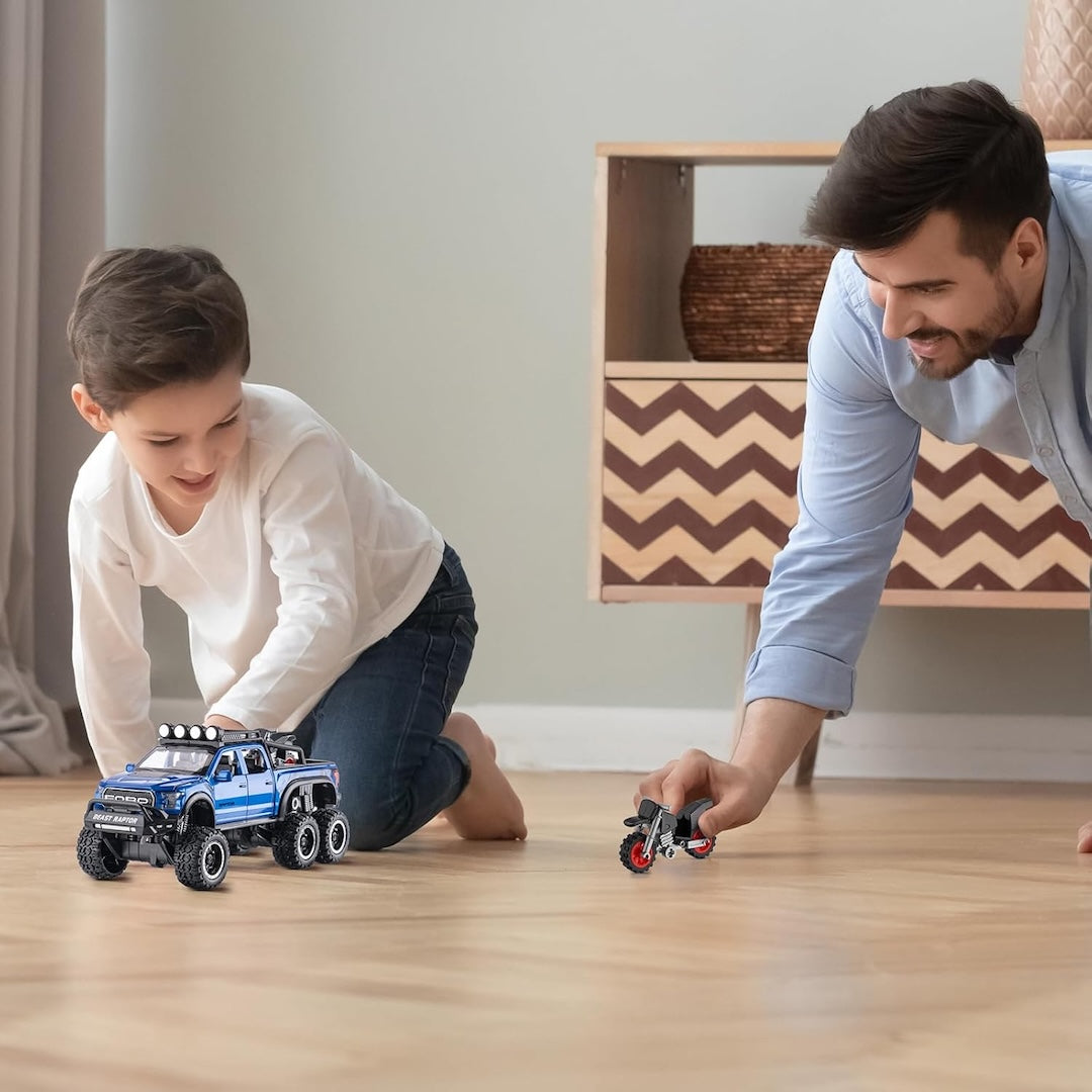 A sturdy 1:24 scale die-cast F150-inspired 6×6 pickup truck featuring opening parts, pull-back action, lights, sound effects, and a decorative micro motorcycle. Suitable for kids, collectors, and display use.